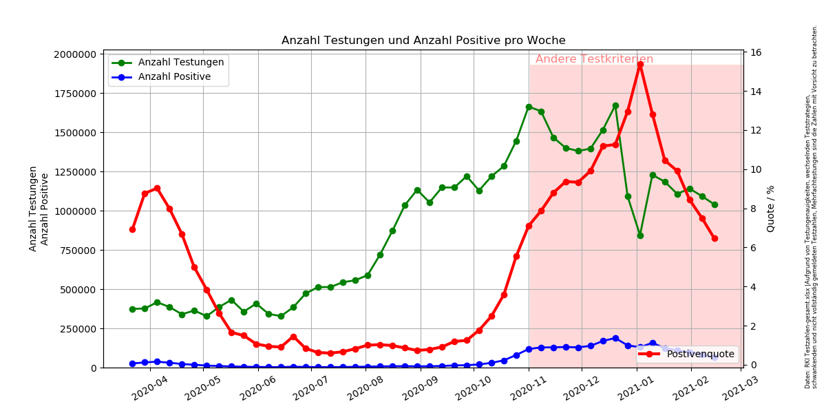 Aufgrund von Testungenauigkeiten, wechselnden Teststrategien, schwankenden und nicht vollständig gemeldeten Testzahlen, Mehrfachtestungen sind die Zahlen mit Vorsicht zu betrachten.